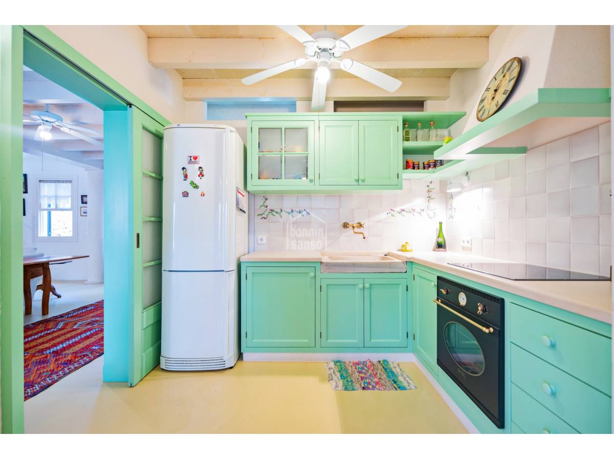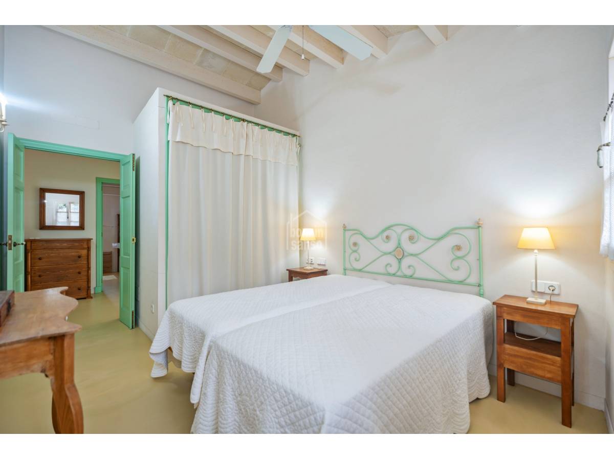 Das Haus bewahrt seinen menorquinischen Charme, mit sichtbaren Holzbalken und marés-Stein, die jedem Raum Charakter verleihen.