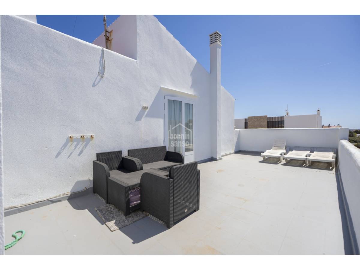 Über eine Außentreppe gelangt man in das Obergeschoss, wo sich eine separate Wohnung mit eigenem Zugang befindet. Diese umfasst ein Wohnzimmer mit offener Küche, ein komplettes Badezimmer, ein Doppelschlafzimmer und zwei Terrassen.