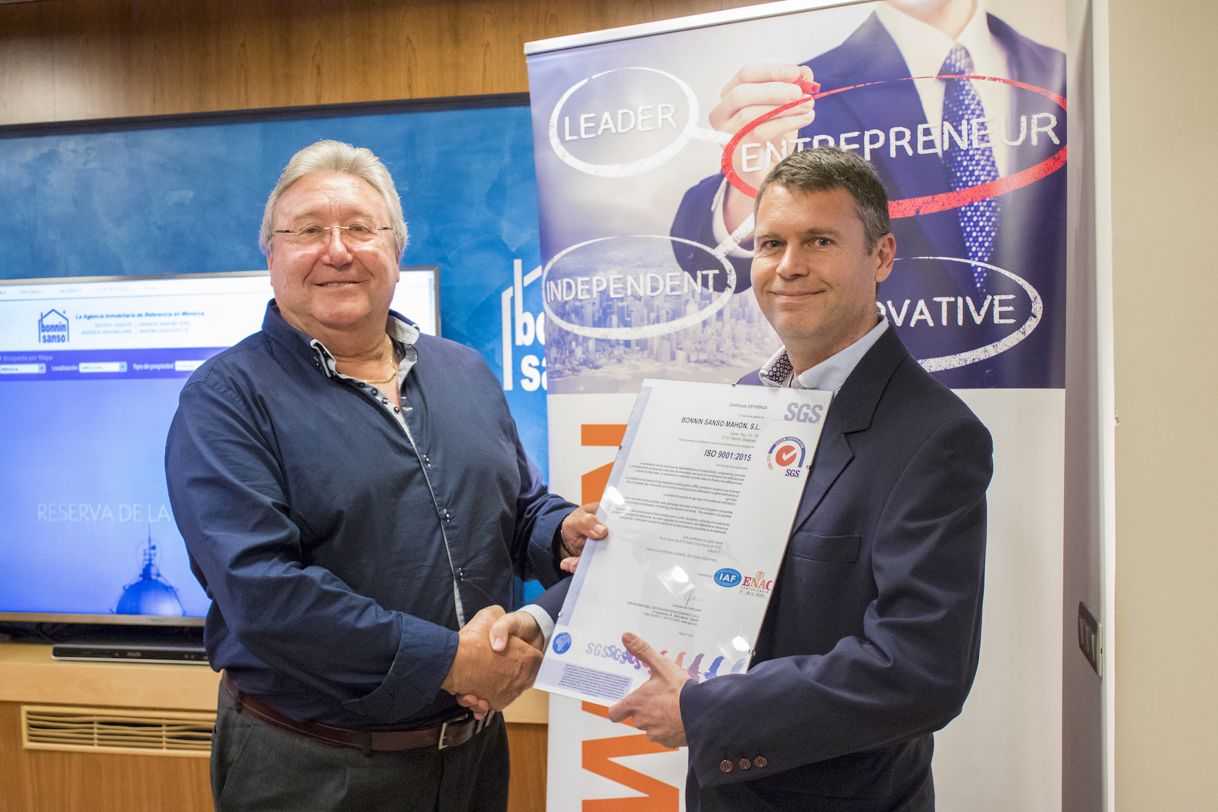 Bonnin Sanso, entreprise leader dans le secteur de l’immobilier à Minorque, vient de recevoir le certificat ISO 9001:2015 de Qualité en reconnaissance pour son travail professionnel et la confiance pour ses services réalisés envers ses clients. Grâce à ce prestigieux titre àcaractère international, qu’a reçul’entreprise des mains de Juan Ros Oliver, Coordinateur Délégué des Baléares de l’experte SGS. Bonnin Sansodevient la première entreprise ménorquine du secteur à l’avoir obtenu. Un fait marquant pour l’entreprise, qui l’année dernière célébra le trentième anniversaire de sa fondation comme agence immobilière de référence, ce qui suppose être un bon soutien pour son développement.
