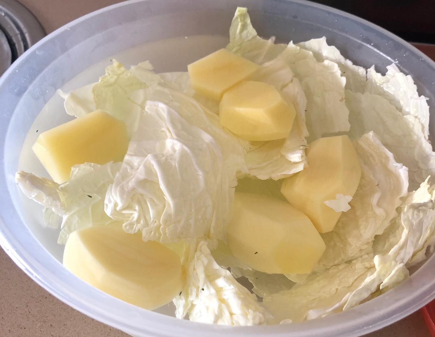 When it comes to the boil add the potatoes. Boil for 25 minutes then add the cabbage and boil for about 15 minutes.