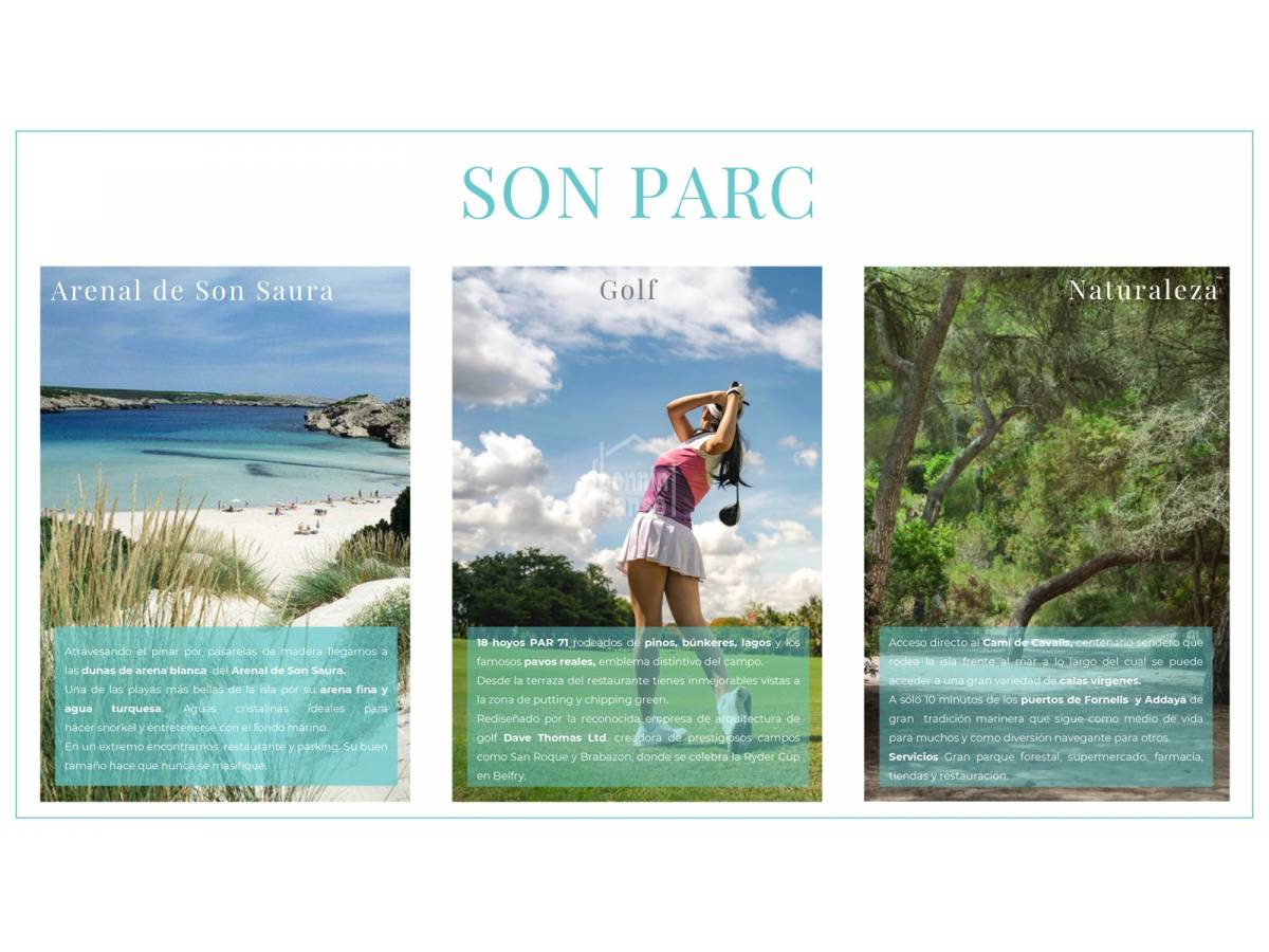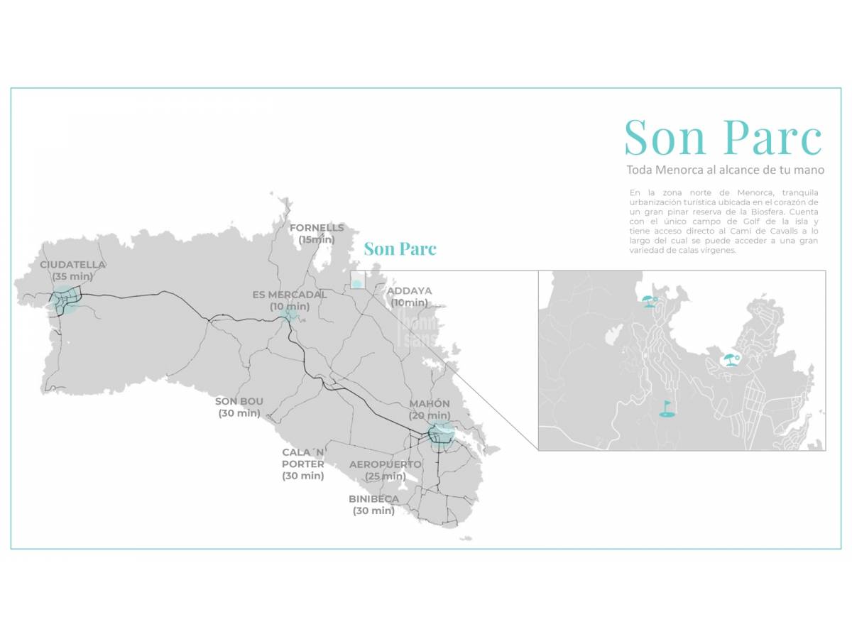 This is a quiet tourist resort on the north coast of Menorca, belonging to the borough of Es Mercadal. Privileged with several attractions that make it special. It has the only golf course in Menorca and is very close to the beach of Son Saura, which houses one of the most largest sandy beaches on the island. In addition, to the west lies the beautiful bay of Fornells where practicing water sports is a must for the whole family. The access to this urbanization is direct from the main road that runs between the towns of Mahón and Fornells.